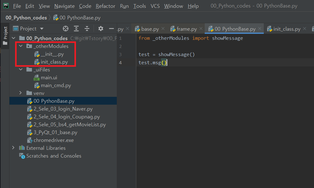 class showMessage를 불러옵니다.#main.py from _otherModules import showMessage test = showMessage() test.msg()