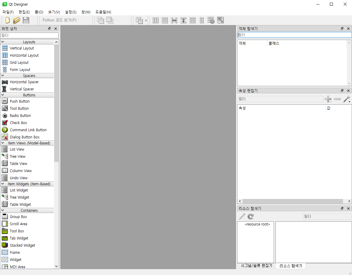위 예제와 같이 직접 GUI 코드를 작성하여 GUI를 구성할 수 있습니다. 하지만 Qt Designer를 사용하여 드래그&드롭으로 편리한 GUI구성을 할 수 있습니다.