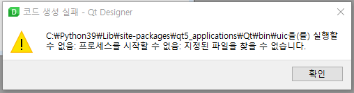 - 오류 : C:\Python39\Lib\site-packages\qt5_applications\Qt\bin\uic을(를) 실행할 수 없음: 프로세스를 시작할 수 없음: 지정된 파일을 찾을 수 없습니다.