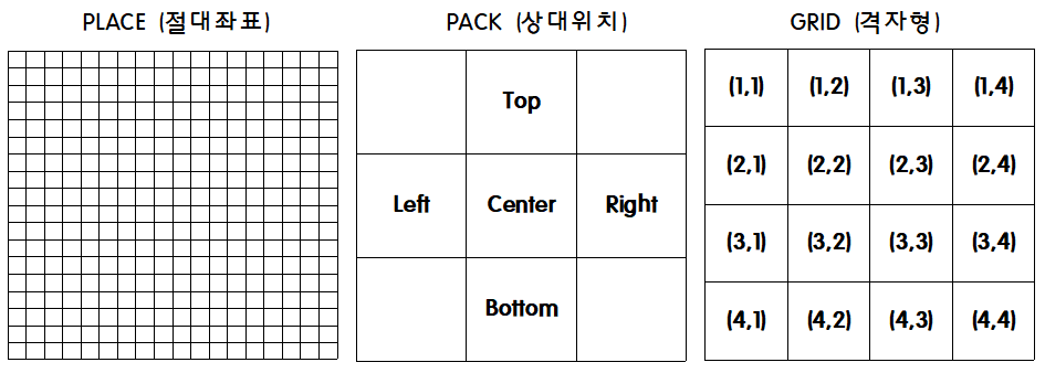 - Tkinter에서 Button, Entry 등 "위젯"을 배치하기 위해서 아래의 3가지 방법을 이용할 수 있습니다.
